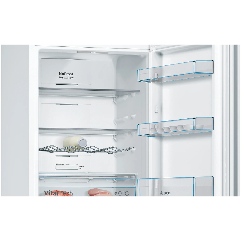 El Bosch KGN366WCF es un frigorífico combi de libre instalación con tecnología No Frost, diseñado para conservar alimentos de forma eficiente y sin necesidad de descongelación manual. Con una capacidad total de 326 litros, está pensado para hogares de tamaño medio que buscan un electrodoméstico funcional, duradero y con un diseño limpio en color blanco.