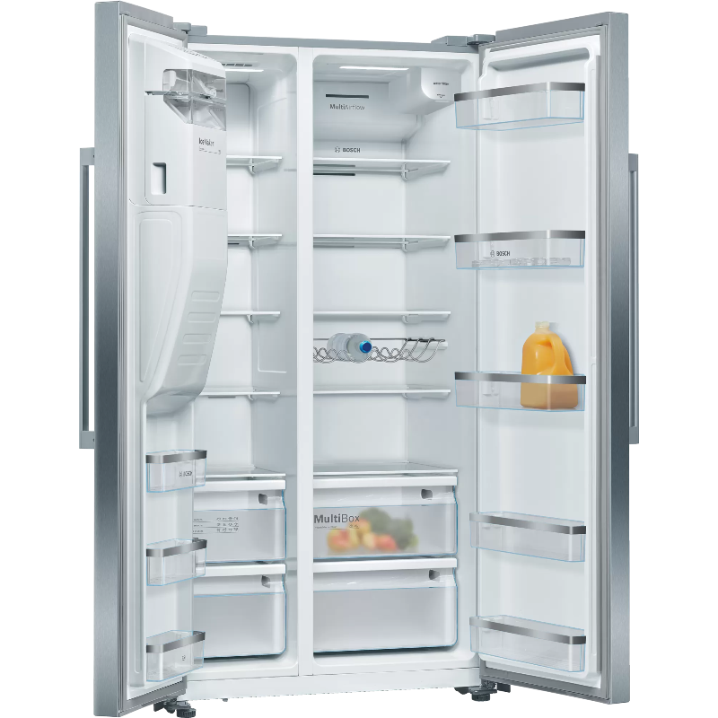 El Bosch Serie 6 KAD93AIEP es un frigorífico americano No Frost de 562 litros de capacidad total, diseñado para hogares que requieren un amplio espacio de almacenamiento, organización eficiente y tecnología avanzada en conservación de alimentos. Es ideal para familias numerosas, personas que cocinan con frecuencia o quienes desean mantener una gran variedad de productos frescos y congelados siempre disponibles.