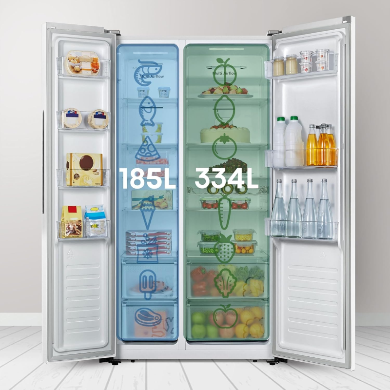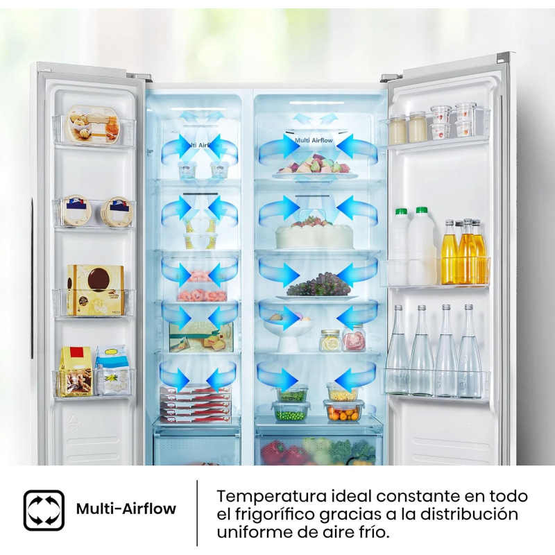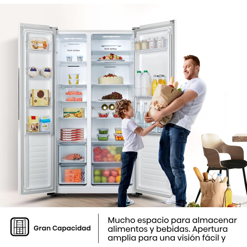 El Hisense Frigorífico Americano Side by Side Total No Frost es un electrodoméstico de refrigeración de gran capacidad diseñado para hogares que requieren amplio espacio de almacenamiento, eficiencia energética y tecnología moderna para conservar alimentos frescos por más tiempo. Es ideal para familias numerosas, personas que cocinan con frecuencia o quienes desean mantener una organización clara entre alimentos refrigerados y congelados.