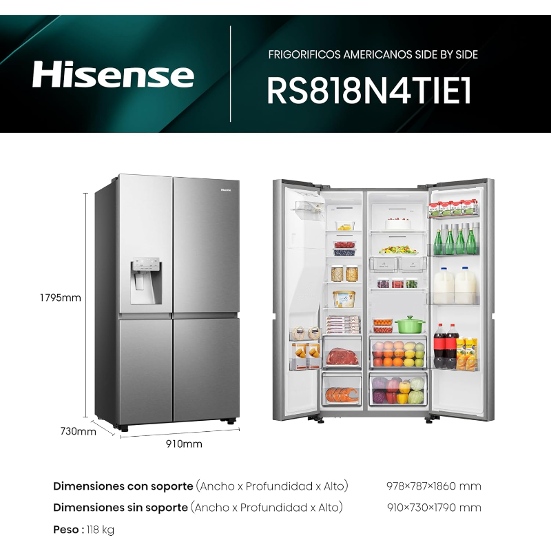 El Hisense RS818N4TIE1 es un frigorífico americano Side by Side con tecnología No Frost y una capacidad total de 632 litros. Está diseñado para hogares que requieren un amplio espacio de almacenamiento, ideal para familias numerosas o personas que desean conservar grandes cantidades de alimentos frescos y congelados de forma organizada y eficiente.