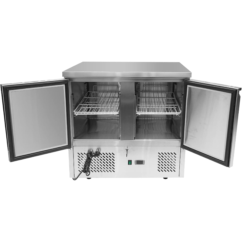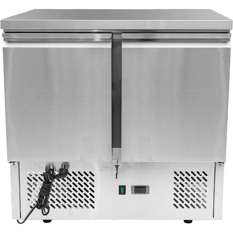 Es una mesa de acero inoxidable que enfría por dentro y sirve para guardar alimentos frescos mientras se trabaja sobre ella. Tiene puertas que se cierran solas, estantes que se pueden mover, y mantiene la temperatura adecuada. Es fácil de limpiar, ahorra espacio y ayuda a trabajar más rápido y mejor en la cocina.