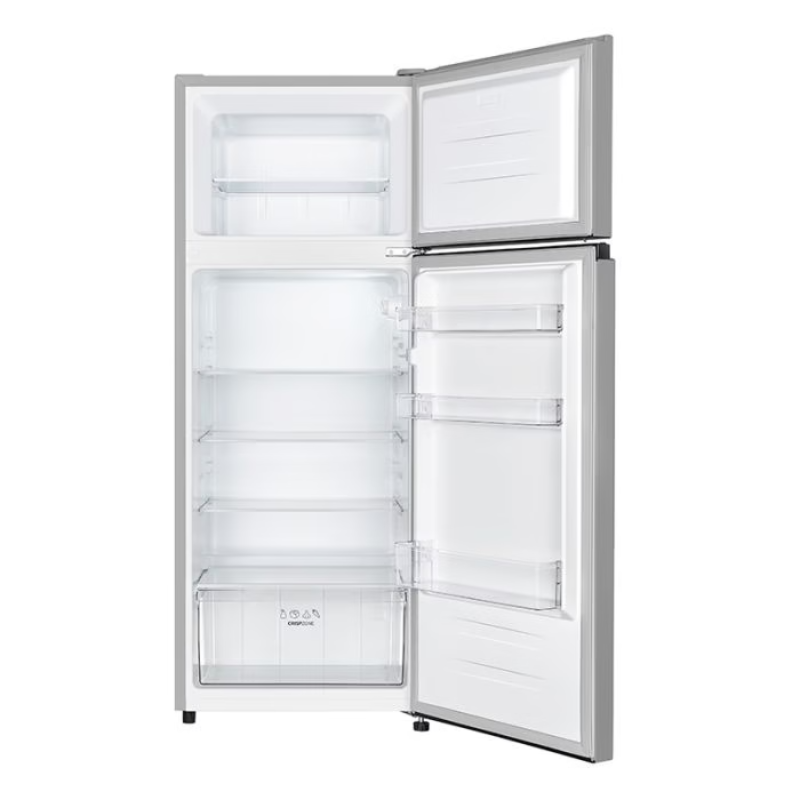 Este frigorífico de dos puertas es ideal para quienes necesitan un electrodoméstico práctico, con espacio suficiente para guardar alimentos frescos y congelados. Es silencioso, consume poca energía y tiene un diseño moderno en color plata. Sus estantes ajustables y cajones facilitan la organización, y su tamaño compacto lo hace perfecto para cocinas medianas o pequeñas.